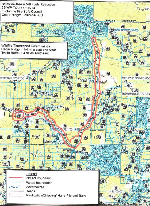 The project will establish a 148-acre, 2.1-mile Shaded Fuel Break along Big Hill Road and Kewin Mill Road, anchored by Belleview Elementary School—a critical community resource located at the intersection of these two roads. The fuel break will span 300 feet in width—150 feet on each side from the road centerline—and will significantly reduce hazardous vegetation in this high wildfire-risk area.